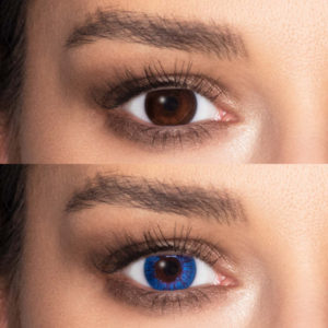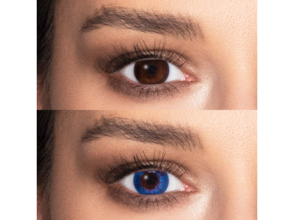 The final effect of coloured contact lenses varies from wearer to wearer. Colour shade is influenced by many factors, the most important being the natural colour of the iris of the eye. Darker irises are more difficult to overlap than light. The overall impression of the colour change is also influenced by the colour of the wearer’s clothes and accessories and by lighting conditions. The effect will appear different in artificial and natural light.